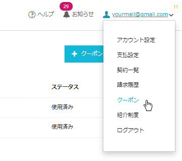 To check your coupon, click your email address in the upper right of My Page and select “Coupon” from the dropdown menu.