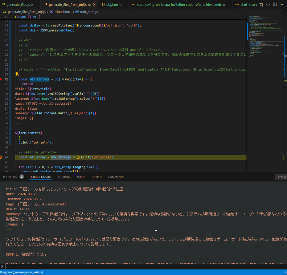 obj.map(a => `---\ntitle: '${a.title}'\ndate: ${new Date().toISOString().split('T')[0]}\nlastmod: ${new Date().toISOString().split('T')[0]}\ntags: [drawing tools, AI-assisted]\ndraft: false\nsummary: '${a.content.match(/(.+)\n\n/)[1]}'\nimages: []\n---\n\n${a.content}`).forEach((a, i) => {